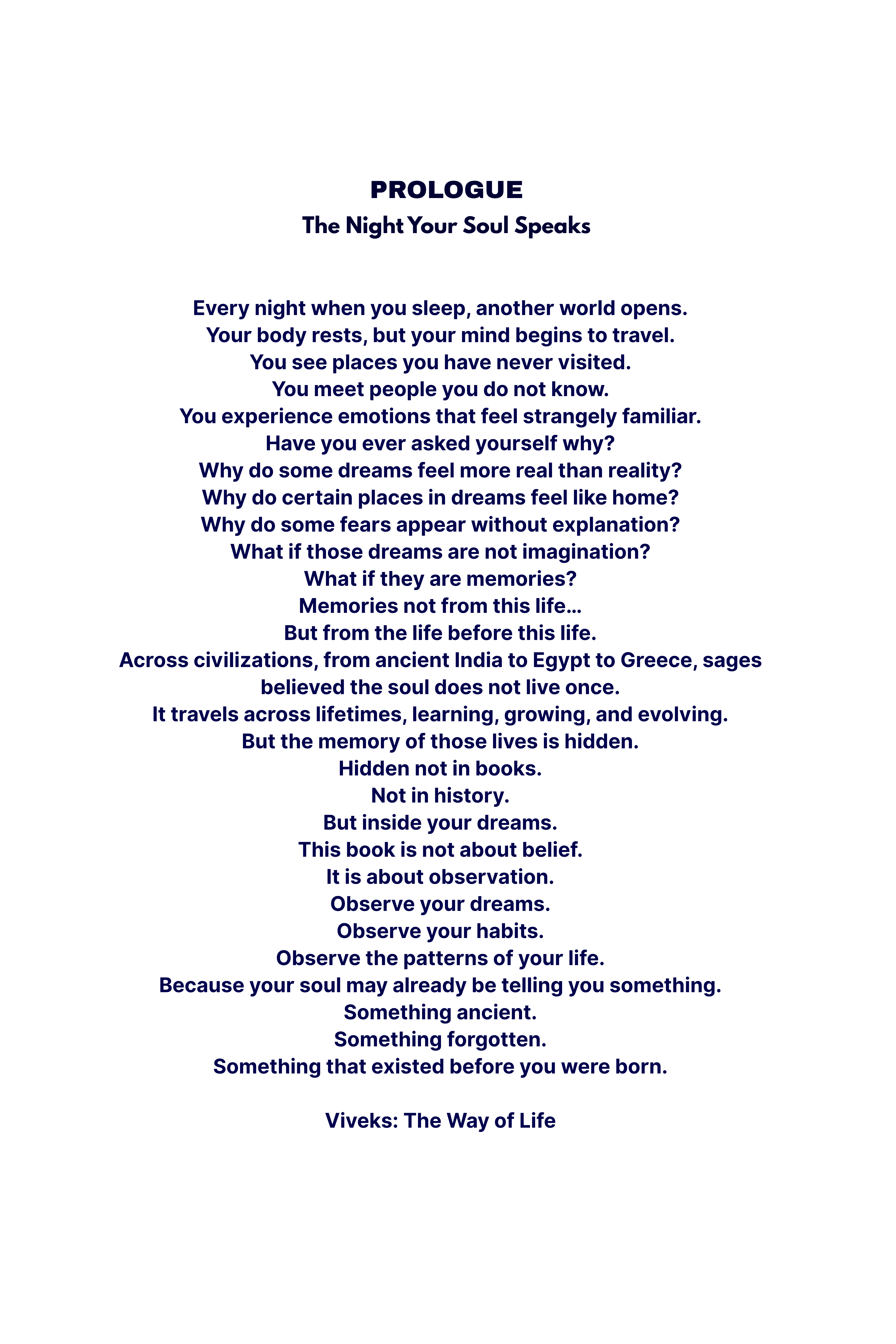 From childhood, I had a unique habit of writing small captions under my name : “Viveks - In In-Difference,” “Viveks - The Way of Life,” “Viveks - Sky is the Limit,” and “Viveks - Let Me Be Me.” One day, I unknowingly wrote the words “Life Before Life.” That simple phrase sparked a deep curiosity within me and led me to explore questions about existence, purpose, and the journey of the soul before this life.